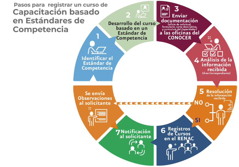 Registro Nacional de Cursos de Capacitación Basados en Estándares de CompetenciaEl Registro Nacional de Cursos de Capacitación basados en Estándares de Competencia (RENAC) es un catálogo que facilita a los usuarios del Sistema Nacional de Competencias (trabajadores, empresarios, sector social, educativo y gobierno) la consulta y el acceso a los cursos de capacitación que han sido inscritos y gestionados por los Centros de Capacitación o Capacitadores Independientes. Los Centros de Capacitación o Capacitadores Independientes que así lo deseen, podrán solicitar al CONOCER la inscripción de sus programas de capacitación con base en Estándares de Competencia, en el Registro Nacional de Cursos de Capacitación basados en Estándares de Competencia. Requisitos para solicitar inscripción en el Registro Nacional de Cursos de Capacitación basados en Estándares de Competencia: Las Reglas Generales y criterios para la integración y operación del Sistema Nacional de Competencias, en su artículo 35 refieren que se entiende como Centro de Capacitación o Capacitador Independiente, a las personas morales, organización o institución pública o privada, unidad administrativa de alguna Dependencia, Entidad o su similar en los niveles de gobierno Federal, Estatal o Municipal, o personas físicas que realizan acciones de capacitación con base en Estándares de Competencia, inscritos en el Registro Nacional de Estándares de Competencia, a fin de habilitar a las personas para participar en procesos de evaluación con fines de certificación.